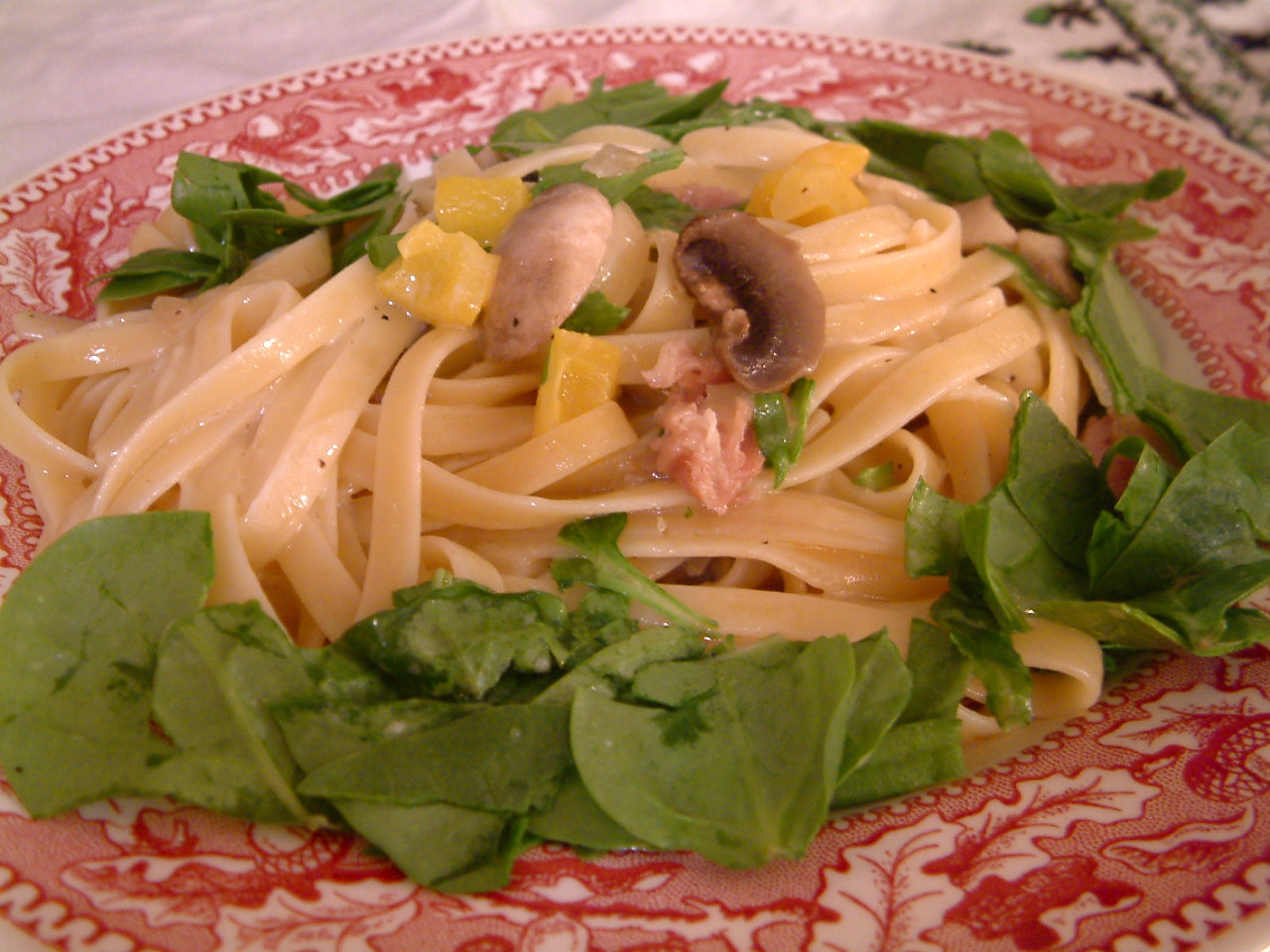 To extend the Olympic spirit just a bit longer I embellished fettuccine alfredo to evoke the slopes of Whistler complete with metaphorical splashes. Think cream of the crop. (I know, bear with me. The winters are long in Boston.) I sautéed onion and mushroom with yellow (gold!) pepper and ringed the plate with (a laurel wreath!) baby spinach. Every athlete knows how important it is to eat your spinach. So slide your fork down this white-coated mound of pasta, twirl it in the air, and deliver it to your winner’s podium. Taste the gold. Give it your all. Do it for your country. You earned it. Smile.