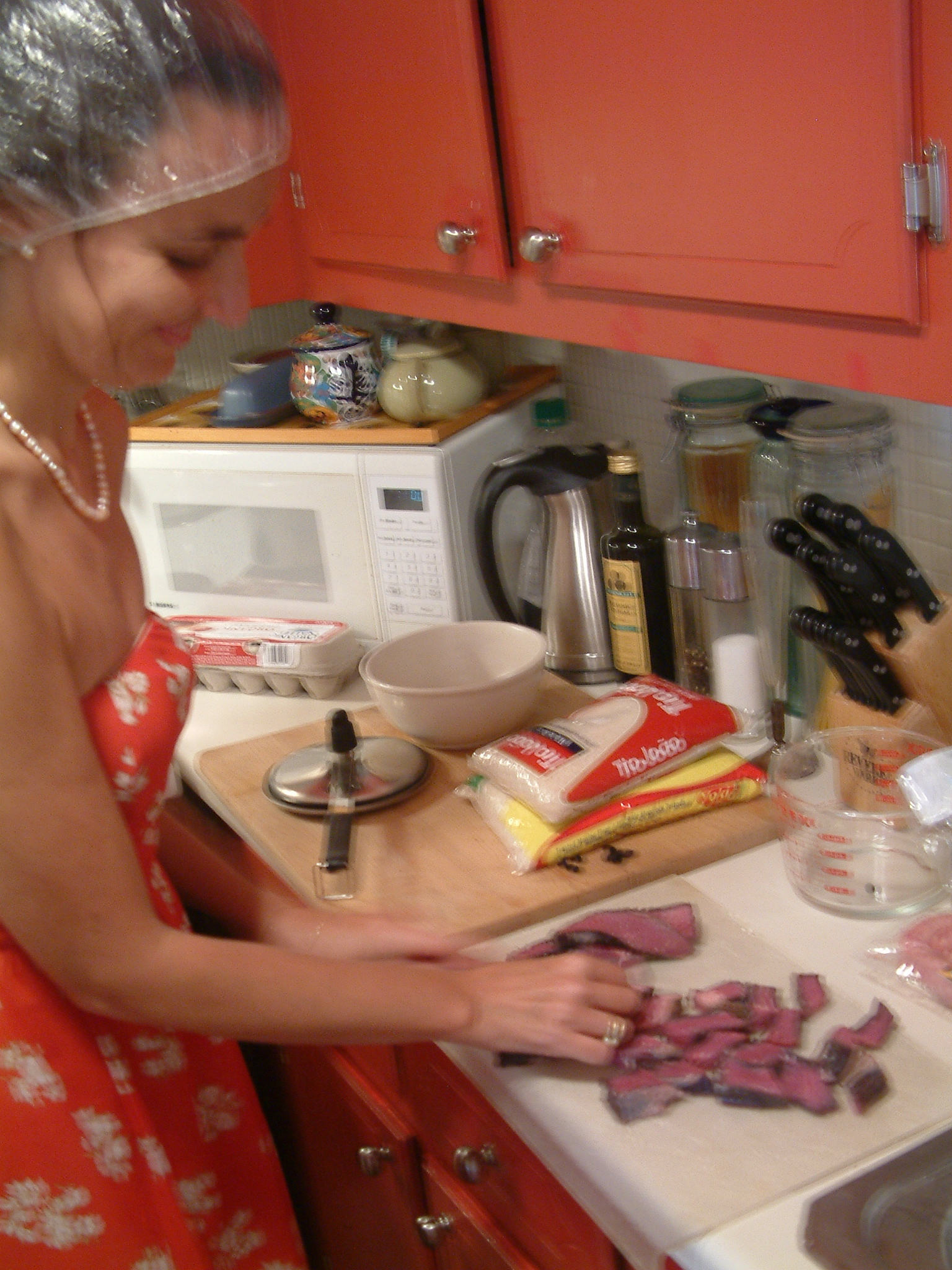Yes. That’s right. The woman is wearing a strapless, floor-length sundress and a shower cap. Evelin, being the practical person that she is, explains the cap is to protect her hair “from the smell.” Huh? Sure enough, as “we” get cooking the beef, two kinds of sausage, salty pork, and bacon in olive oil and butter, my tiny apartment gets a bit … pungent.
