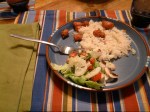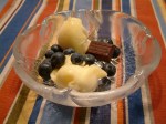 We cook the beans and the meat and then let it rest while we eat a simple lunch of rice, sausage, and onion and a green salad with dill dressing. We chase that down with Giovanna‘s mango sorbet (they are local!), blueberries, and squares of dark Taza chocolate (also local!).
