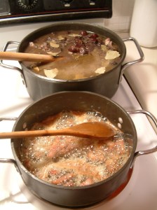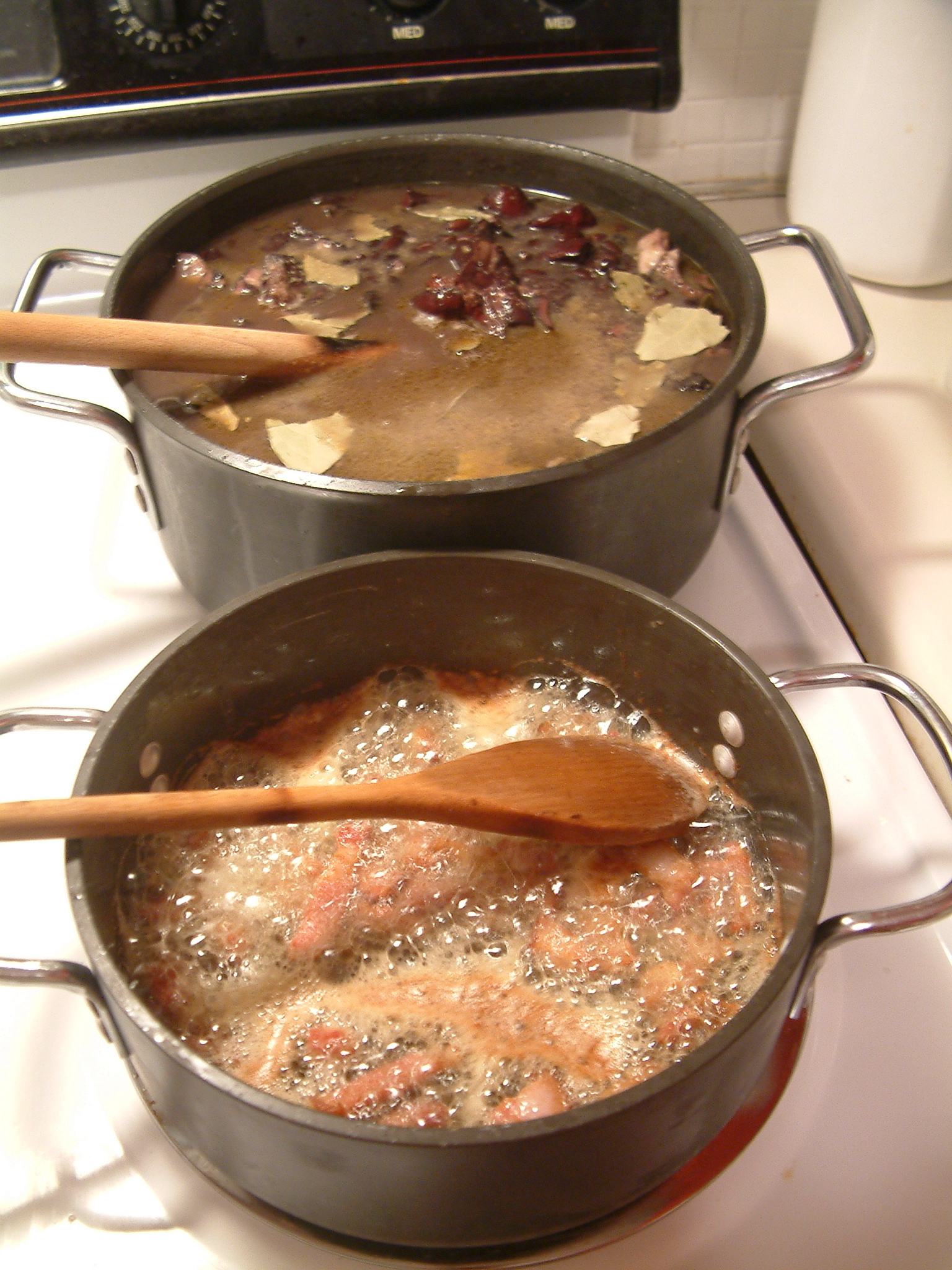 As the beans simmer, brown the chopped garlic in the olive oil until it caramelizes, add to the meat and bean stew. Take some of the liquid from the stew and pour it to the now empty garlic pan. Scrap off caramelized garlic remains from pan to capture flavor, and add liquid back to the stew pot.