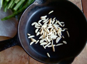 Toast a few slivered almonds in a pan for a few minutes, without oil, until they are golden brown. Set aside.