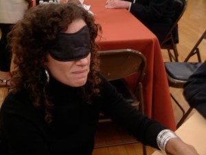 I did not like being blindfolded so much. I got dizzy almost immediately and the room seemed much, much louder. And you have to trust everyone around you. Exhausting. Leslie once ran the entire Boston Marathon blindfolded.Triple exhausting.