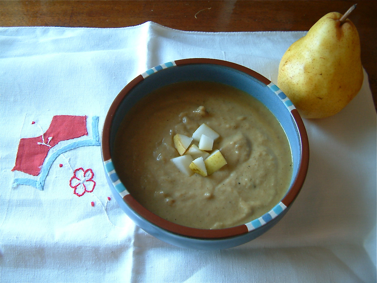 Divide soup among bowls and garnish with diced pear and celery leaves.