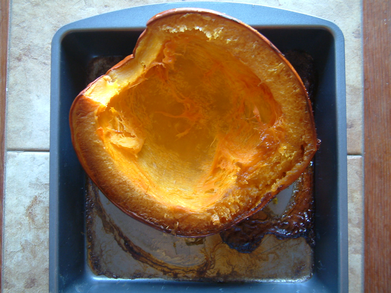 My first batch of pumpkin raisin muffins was a little underwhelming in flavor. Maybe it’s because I had softened the pumpkin in the microwave like I have done for spaghetti squash in order to purée it. I still had half of Miss Pumpkin left. So for the second batch I tried roasting the pumpkin, based on the instructions I found on The Gourmand Mom.