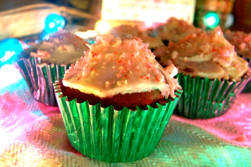 Anyway, back to the flavors of Christmas. I briefly thought about making a gingerbread cupcake with a peppermint cream cheese frosting but in the end I went with the more traditional lemon frosting and used the peppermint to top off some chocolate cupcakes. I added some freshly grated ginger to the cupcake cake batter, just to boost the flavors a bit.