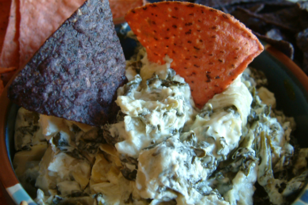 If you are watching the election returns tonight with friends who may or may not share your political persuasion, maybe you should break out a bag of blue and a bag of red tortilla chips (and maybe a plain corn one for Third Party fans) and dig into this delicious, warm artichoke and spinach dip.