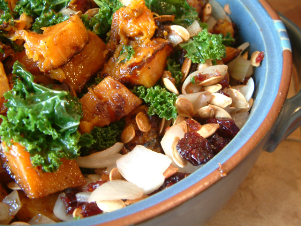 Kale and butternut squash have been popular vegetables in recent years. This roasted butternut with kale dish combines these healthy flavors with dried cranberries and roasted pumpkin seeds.