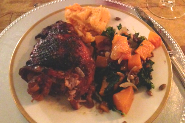 So I actually relished the challenge to pull together a meal on my own, with an assist from Mom. I didn’t want to cook up a whole turkey so this recipe for cider-braised turkey thighs that The Gourmand Mom had posted a few years ago seemed like the perfect solution. We also cooked up roasted butternut squash with kale and did a mash of white and sweet potatoes with chocolate pecan pie for dessert. Even without stuffing or rolls, that was really enough!