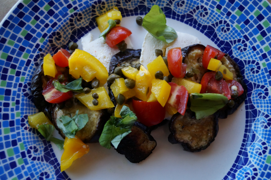 Eggplant tricolor is a traditional Italian dish and featured in “Plenty.” Ottolenghi mixes it up a bit by suggesting the use of cilantro instead of basil. But I went with basil, because it reminded me of the classic mozzarella and tomato summer salad caprese.