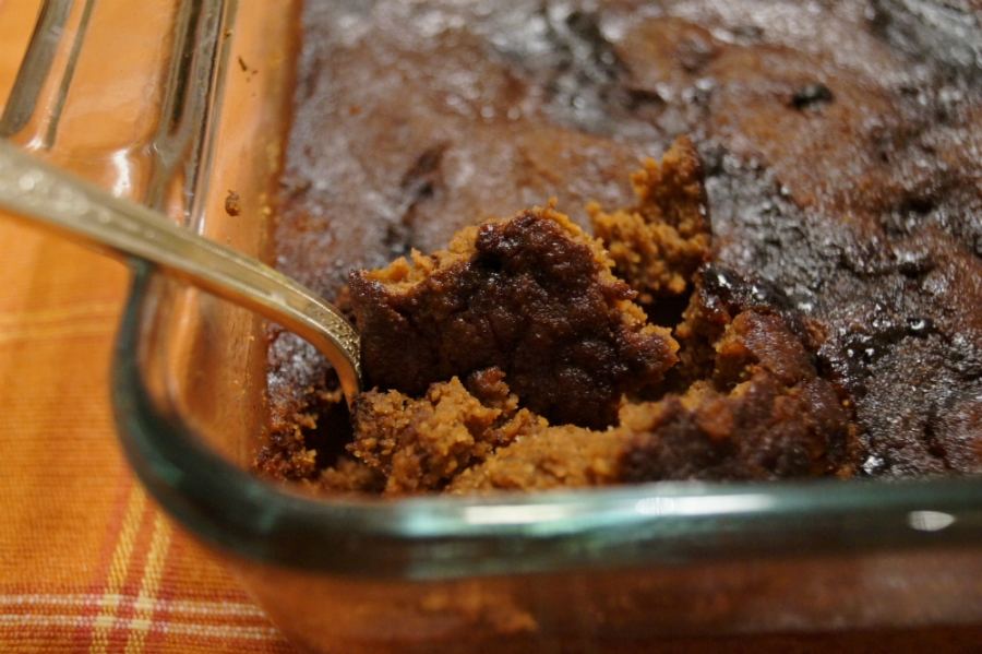 After I pulled it out of the oven, I was a little concerned. It certainly wasn’t going to win for “cutest dessert at the potluck.” I sampled a bit, and a even more concerned. It tasted delicious but was a bit … loose, not at all “gooey” like the original recipe promised. The pumpkin filling helps to hold everything together, but one thing I’m learning about cooking with gluten-free flours such as coconut flour is that they crumble pretty easily. Coconut flour especially absorbs a lot of liquid. I know there are fixes out there, but I’m not there yet. I’m just experimenting.