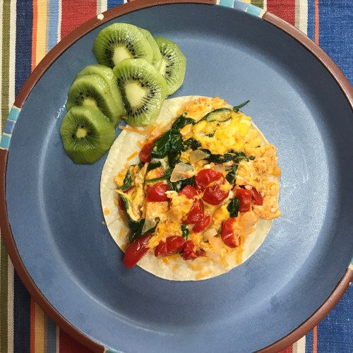 Transfer tortilla to a plate once cheese has melted. Top with egg scramble.